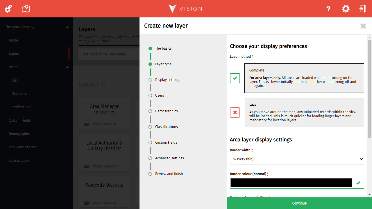 When creating an area layer, you must select your preferred data load method. You can also choose how the data will look on the map or use the defaults already set for you.