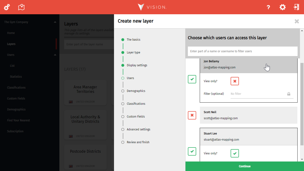 It's now time to choose which users will see this layer in their layer control. If you've got lots of users to choose from, don't worry, as we've added a handy filter at the top of the list. When you select a user, you'll also be able to fine-tune their settings for this layer.