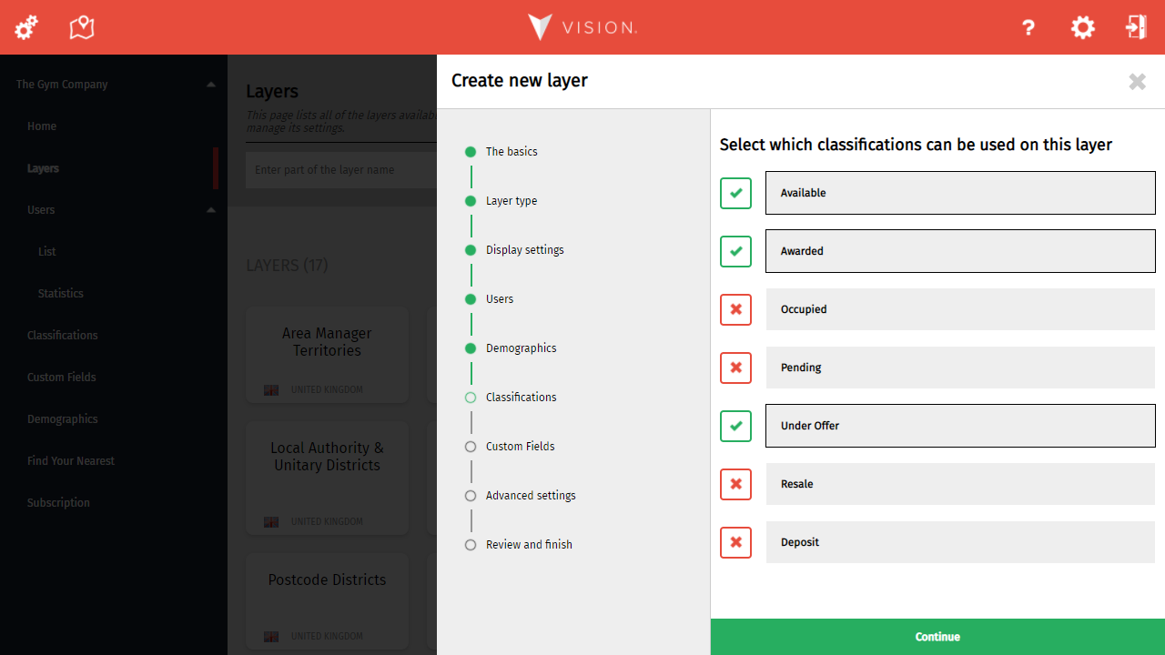 You can now specify which classifications are available for this layer. If you don't want to use classifications with this area, just skip to the next step.