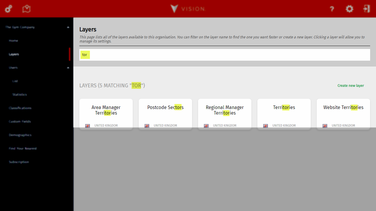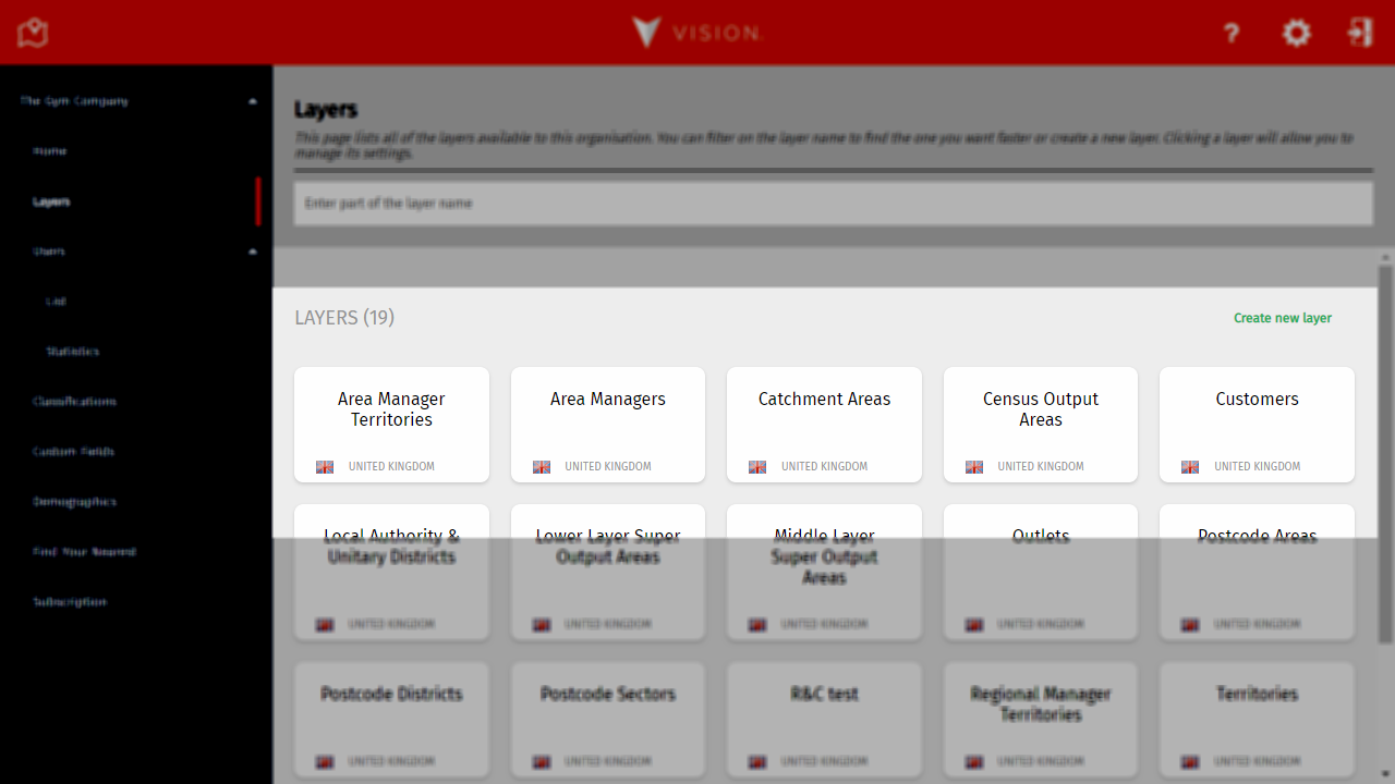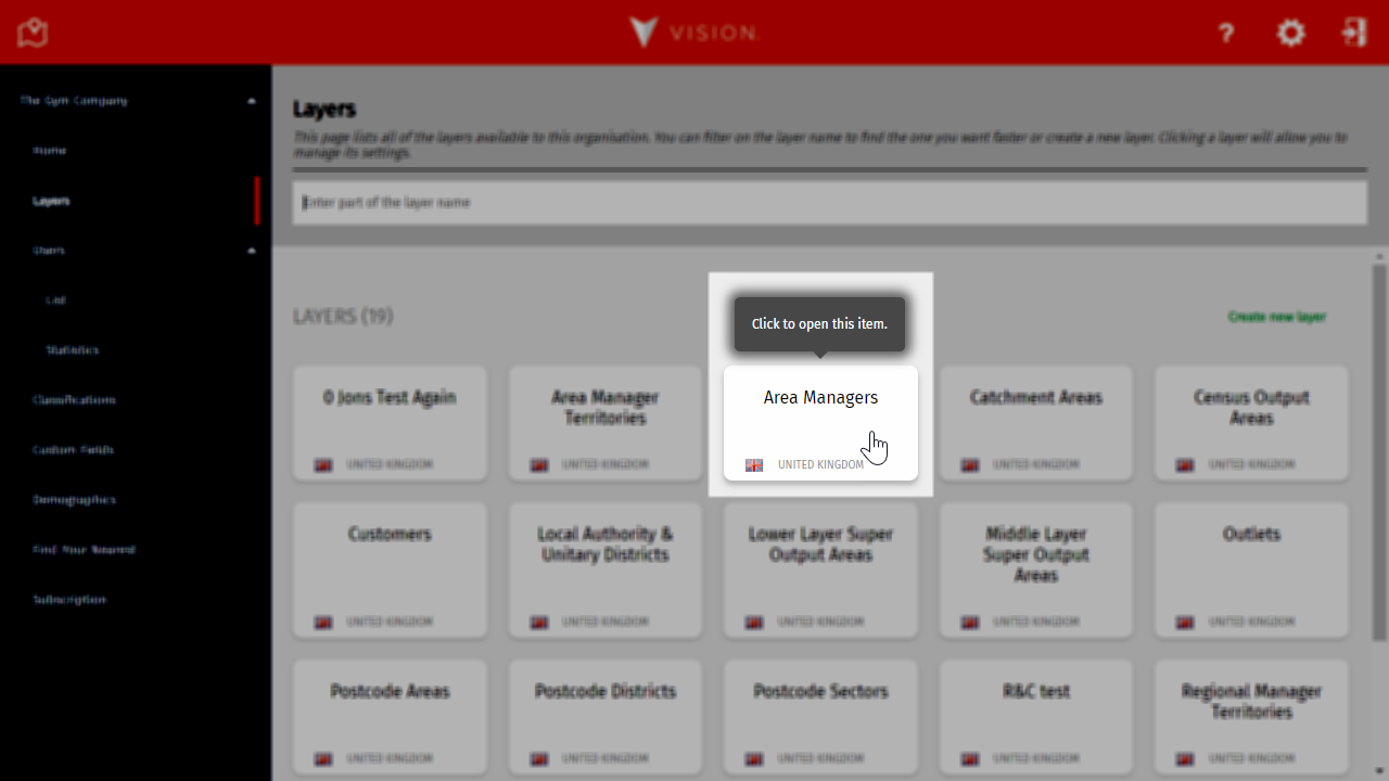 Data within a section is organised into tiles. For pages that provide a list of items, each tile represents an individual item and can usually be clicked to open a summary page for that item (such as a user or layer). On summary pages, tiles usually provide meaningful information on that item.
